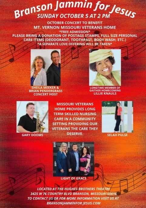 SUNDAY, OCT. 5, 2025 2:00 PM JAMMIN' FOR JESUS HUGHES THEATER 3425 W. 76 COUNTRY BLVD. BRANSON, MO ![]() click above flyer to enlarge Click here for more info https://www.bransonjamminforjesus.com |